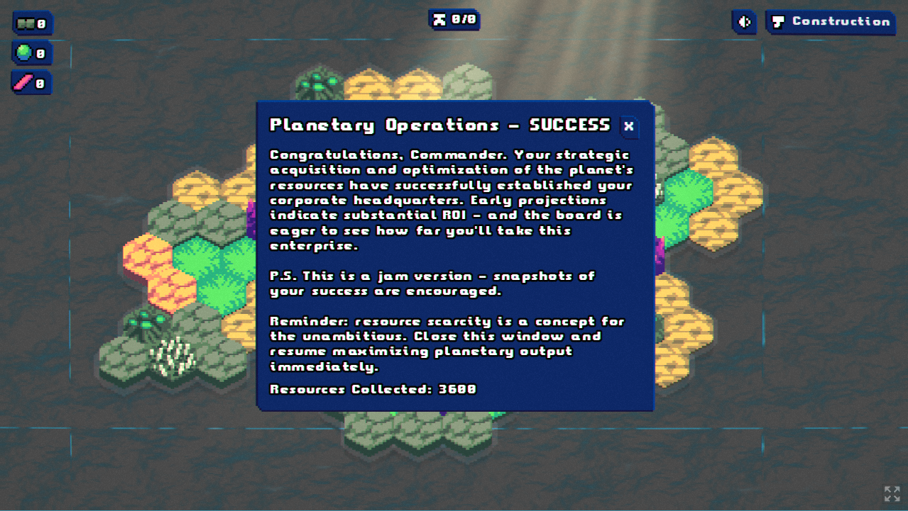 I love this! A really cool Cookie Clicker like! Really well polished. A bit of work and I'd play it as an idle game regularly. So the rest of the Feedback comes from a place of admiration, I don't think I played any other Jam game this long. What I would wish for Gameplay wise is to Upgrade your Buildings and drones, so that you could truly go infinite. I think it would actually make the optimization easier, for example you could add a merge drones option, that merges 2 drones and then they have the carrying capacity of 4. Than you could still have a hard limit on the amount of objects, while making the infinite dream more achievable. The same idea could be used for the Buildings and resources. Polish wise this is near perfect, the only minor adjustments I would wish for are that there is more variation in collection sounds (The sound is great, but you hear it thousands of times), and the background is sometimes a bit buggy and doesn't tile correctly.